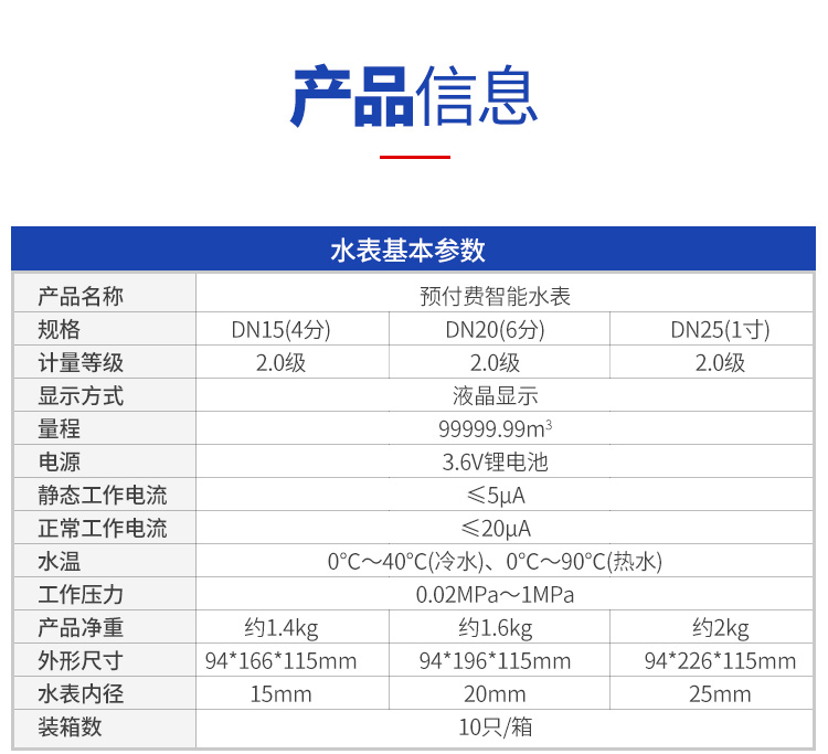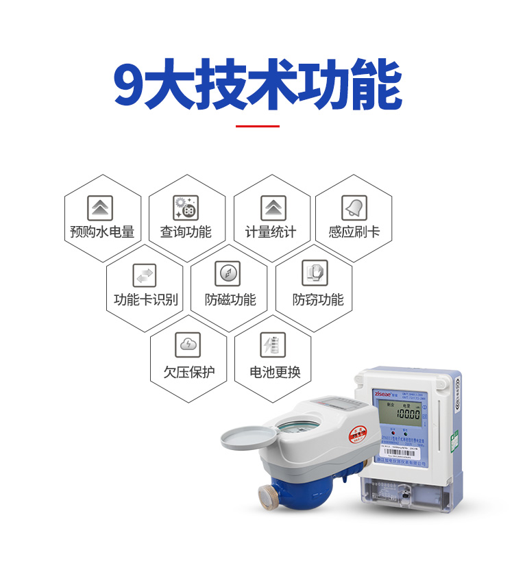 1、概述預付費水表是以旋翼式水表為基表,由干簧管取信裝置、低功耗電控閥門、微電腦控制系統(tǒng)、射頻卡信息系統(tǒng)集合而成的智能水表。該產(chǎn)品改變了傳統(tǒng)的用水收費方 式,由“先用水后交費”變?yōu)椤跋冉毁M后用水”, 每次售水收款都有記錄,解決了“收費難、賬目亂”這兩個水費管理工作中的難題。有遠傳抄表功能的預 付費水表還可實時統(tǒng)計用水數(shù)量,為水費結(jié)算提供依據(jù)。產(chǎn)品符合國家標準GB/T778-2007《封閉滿管道中水流量的測量、飲用冷水水表和熱水水表》的全部技術(shù)要求。
