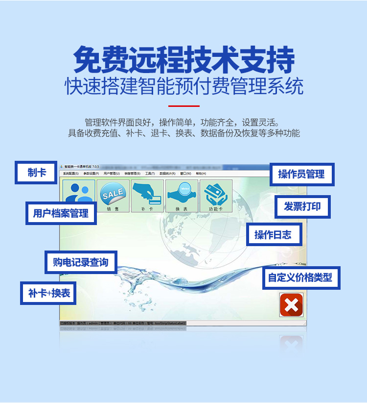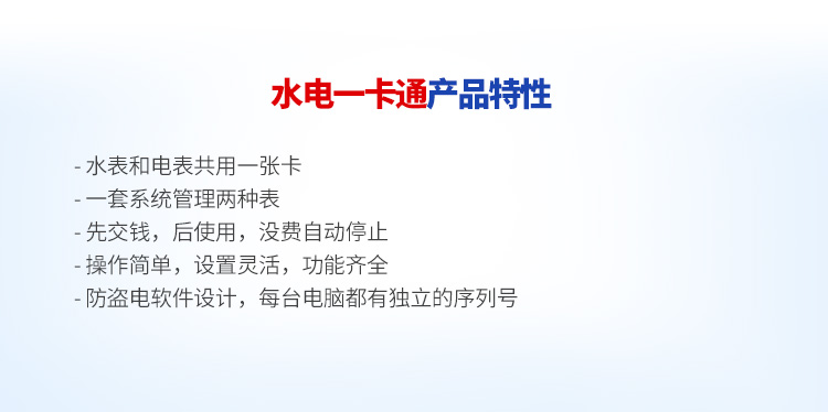 水電一卡通預付費管理系統(tǒng)由本公司生產(chǎn)的預付費電表、預付費水表、讀寫器和一卡通管理軟件構(gòu)成,物業(yè)管理部門可通過本系統(tǒng)完成對水費、電費和天然氣費的智能化管理,無需挨家挨戶抄表收費,由用戶通過一張IC卡購水購電,先交費,后用水用電,解決了抄表累、收費難的問題,該系統(tǒng)是物業(yè)管理部門的好幫手, 該管理軟件界面良好,操作簡單方便,易學易用,功能齊全。